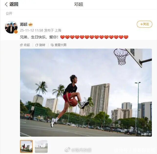 11月12日中午,演员邓超发文为儿子等等庆生,配文:兄弟,生日快乐,爱你!